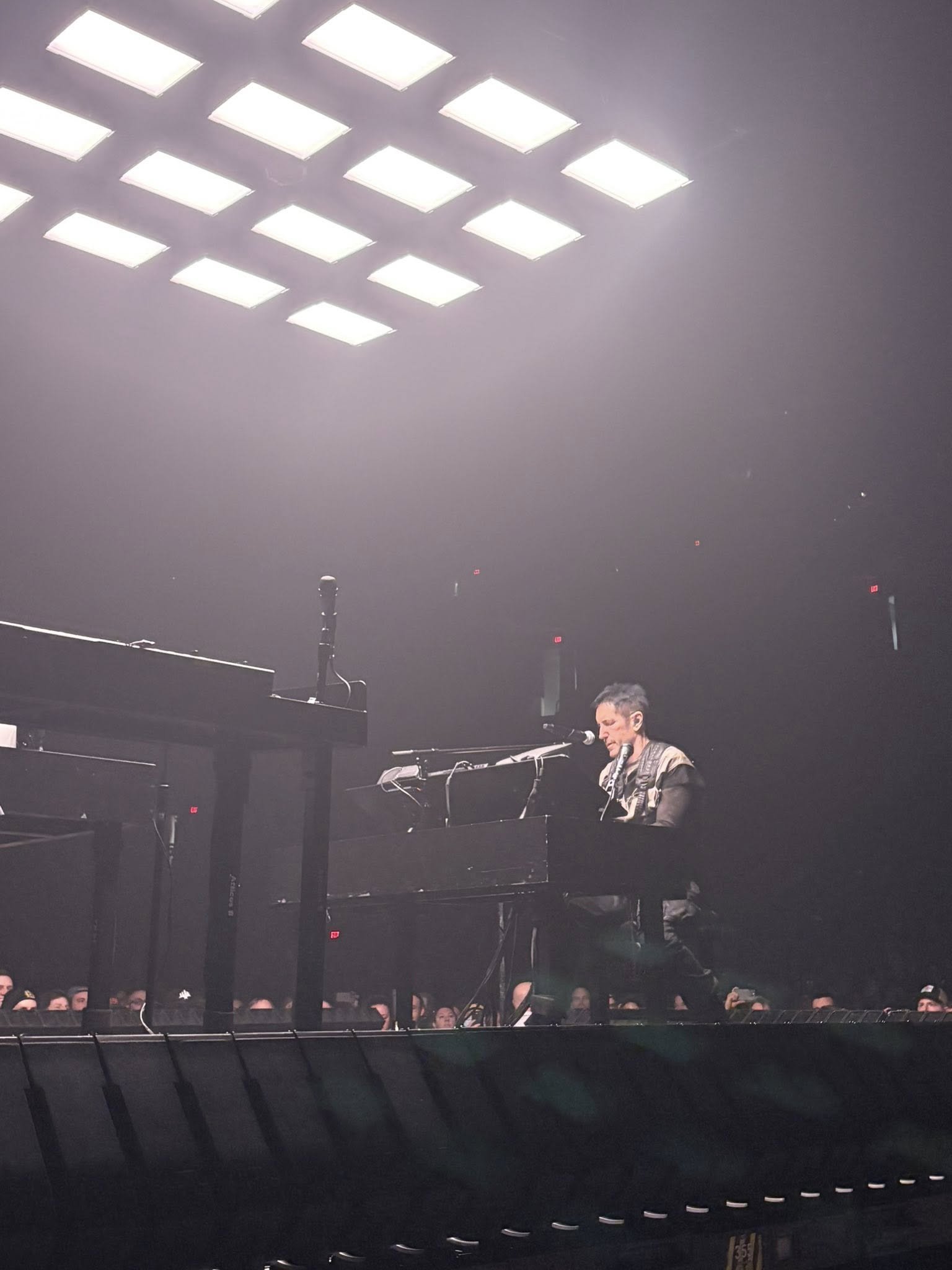 It’s shocking when the curtain drops. For an hour, you were sitting before the second stage, red light pulsing occasionally, the atmosphere set by ominous magnetic loops. Then you’re treated to a thumping DJ set by opening act Boys Noize. All of this is prelude, because you don’t expect the naked vulnerability when the curtain on that second stage drops. It looks like a cube dropped in the center of the arena, like something from another dimension has found its way to our reality. The curtain drops and there he is. This man has provided the soundtrack for over thirty years of your life. He’s probably done more to shape the contours of your life than anyone. He’s right there, he’s at a piano, and he begins slowly, but with purpose. He’s taught you what it means to be vulnerable, and you, you’re an open wound that everyone surrounding you in your life can see. You’ve had to learn how to live with that naked vulnerability, because you can’t hide it. You’ve been broken more times than you can count, sometimes by your own hand. And he’s right there.